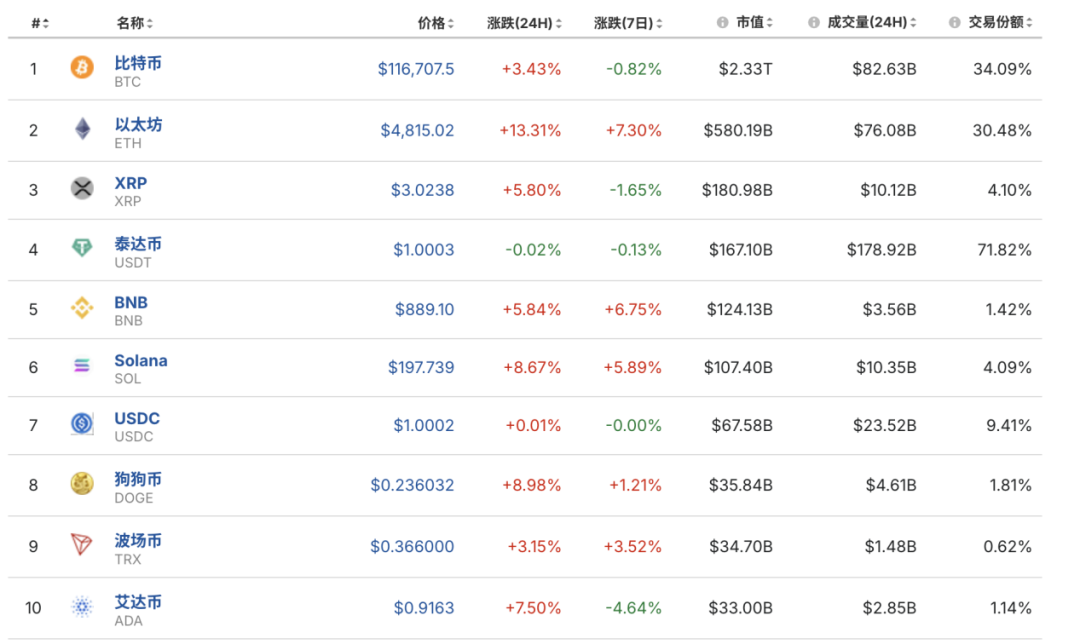 其他加密货币同样走高,比特币、XRP、BNB等均涨超3%。